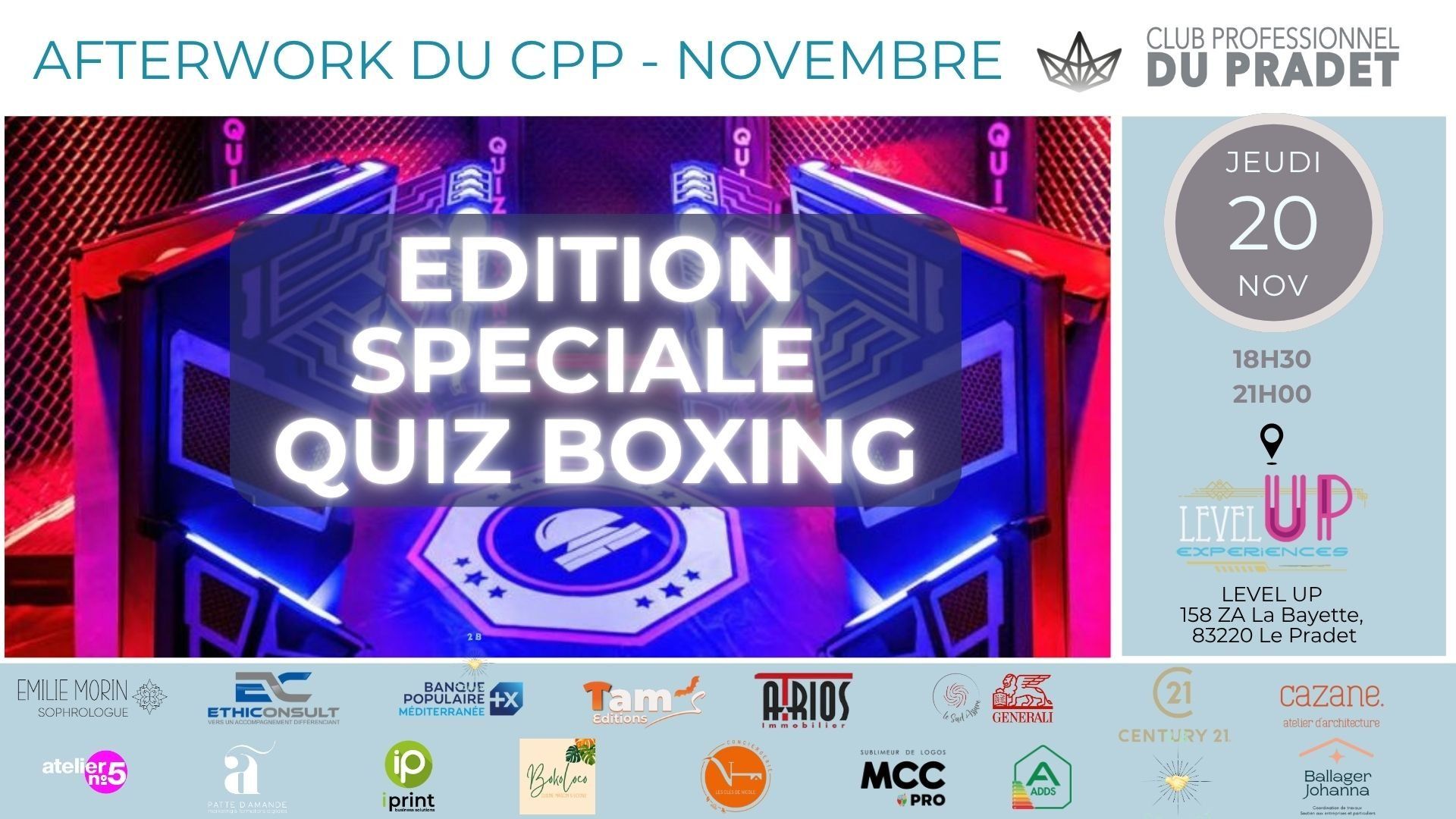 Oubliez les afterworks classiques, le CPP vous propose une Édition Spéciale : Quiz Géant et Réseautage au LEVEL UP au Pradet. C’est l'occasion parfaite de faire le plein de contacts professionnels tout en s'amusant.